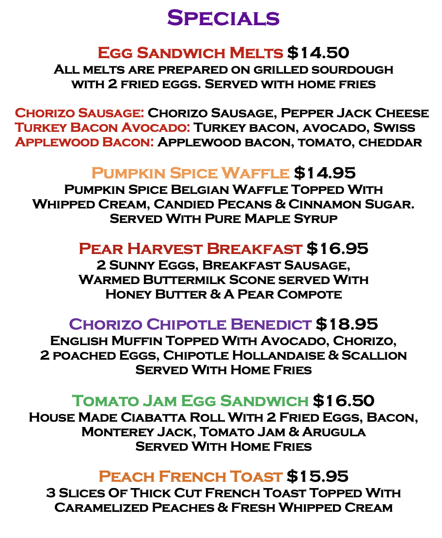 chicken sausage frittata, stuffed french toast, home made corned beef hash or huevos rancheros.