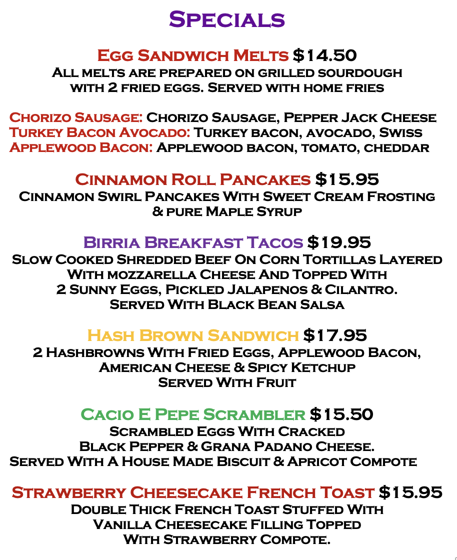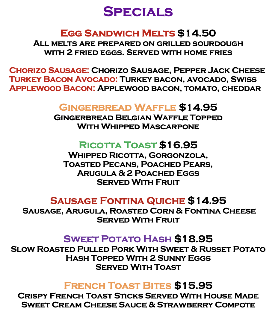 chicken sausage frittata, stuffed french toast, home made corned beef hash or huevos rancheros.