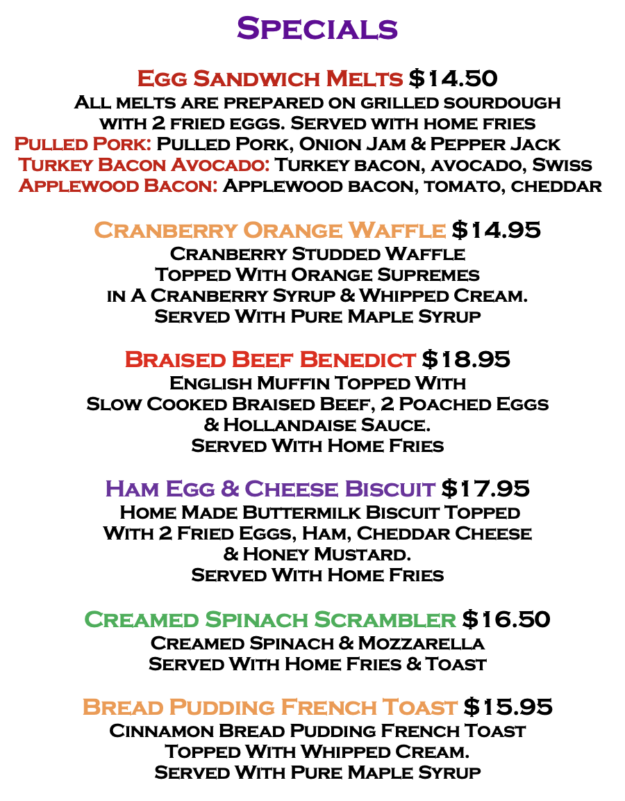 chicken sausage frittata, stuffed french toast, home made corned beef hash or huevos rancheros.
